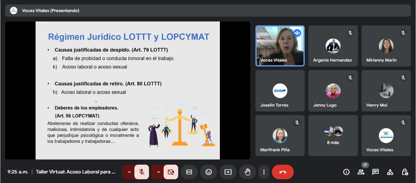 Voces Vitales llevó a cabo de manera virtual el taller «Prevención del Acoso Laboral» dirigido a los gerentes de sucursales del Grupo Zoom International Services C.A. El evento contó con la facilitación de Maria Cristina Parra y Adela Vivas.