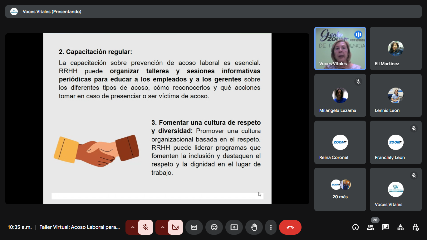 0 Voces Vitales Capacita a Jefes de Área en Prevención del Acoso Laboral en Grupo Zoom International Services C.A. Publicada en 2 abril, 2025 por Voces Vitales Venezuela Voces Vitales llevó a cabo el taller titulado «Prevención del Acoso Laboral» para los Jefes de Área de las sucursales del Grupo Zoom International Services C.A., con la facilitación de María Cristina Parra.